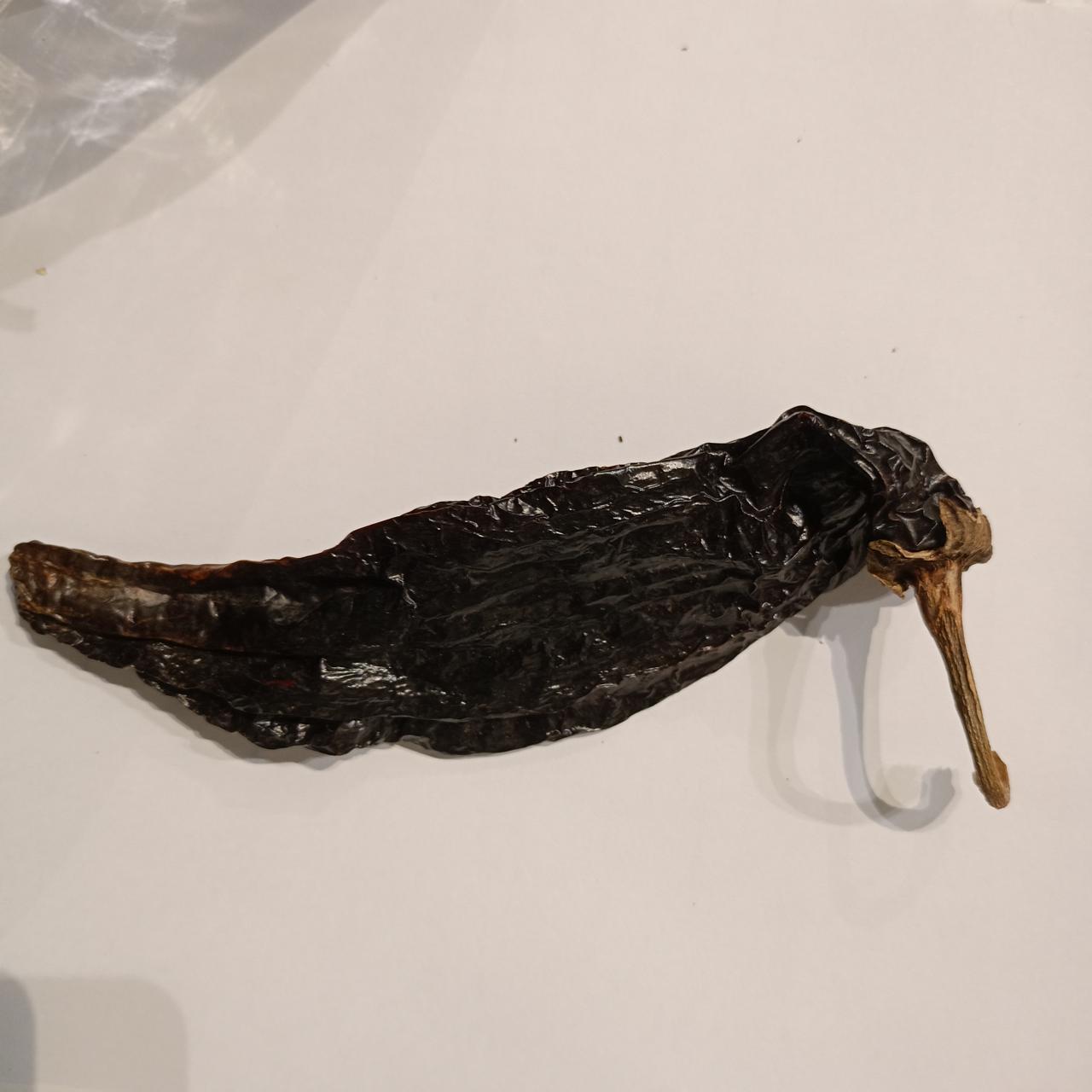 Chile Pasilla, seco y alargado, con un sabor profundo y ligeramente dulce.