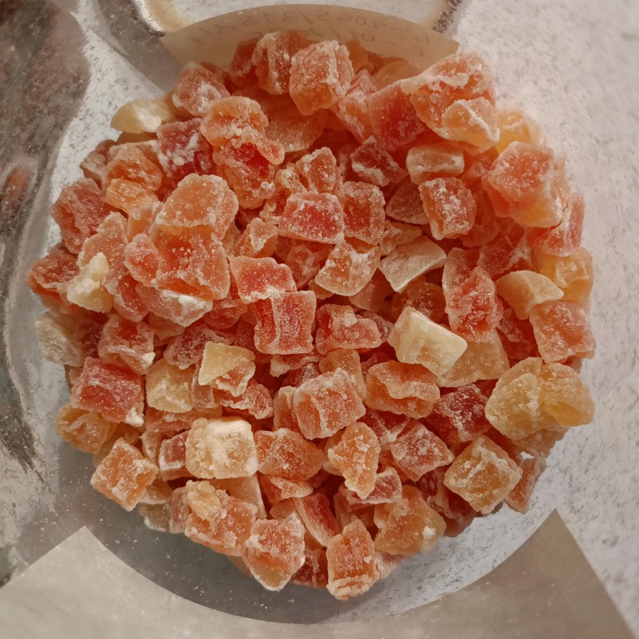 Dados de papaya deshidratada con azúcar, dulces y aromáticos, ideales como snack o en repostería.